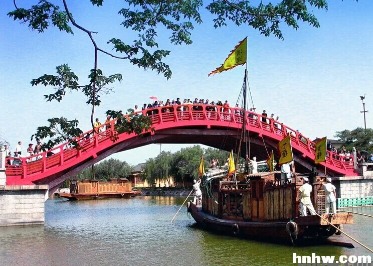 虹桥是飞架在汴河之上。据史书记载,汴河始于战国的魏,通于隋,畅于宋,上起河洛,下至淮泗,直通长江,为北宋南北贯通的大动脉。各地所产的粮食,所收的赋税,各种奇珍异果都是沿着这条河运到京城来的。汴河对于当时的北宋可谓至关重要。由于舟船往来,客商众多,于是在河的两边就出现了许多店铺,在当时的东京城,汴河两岸是最繁华热闹的地方,虹桥左右让铺林立,舟船如梭,商贾云集。今天的虹桥下面,是东京码头,诸位感兴趣的话,可以荡起宋式木船,饱览北国水城的万顷碧波